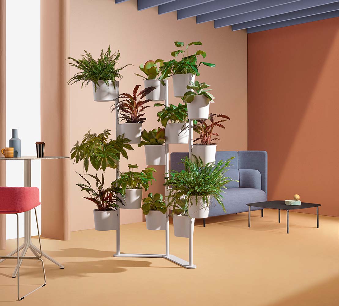 Hevea Partition est un complément d’aménagement polyvalent qui permet de composer des agencements et des murs végétaux au sein des espaces de bureau et d’hôtellerie. Un système de porte-plantes composé d’une base profilée et de trois colonnes en acier sur lesquelles viennent se greffer quinze pots en polypropylène. Les pots se fixent de manière simple et intuitive et peuvent être alternés ou disposés en spirale. Les éléments Hevea Partition sont réunis par un procédé mécanique. Cela permet de les démonter pour faciliter le nettoyage des pots et pour trier correctement les différents composants avant leur mise au rebut. Il est possible de placer d’autres pots sur la structure, qui sont vendus séparément.
