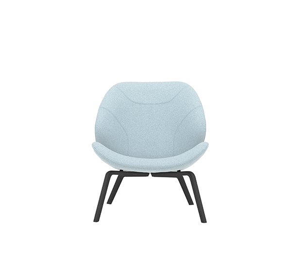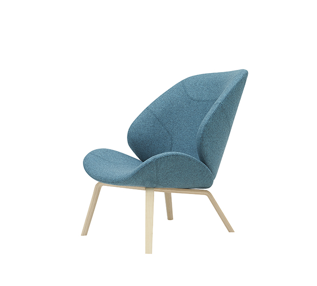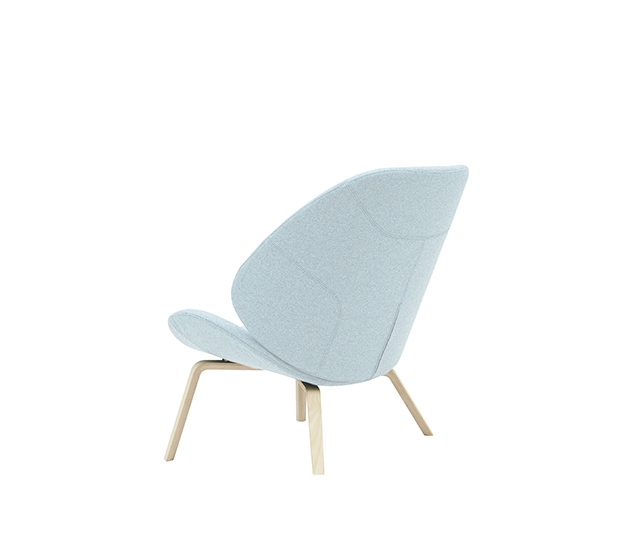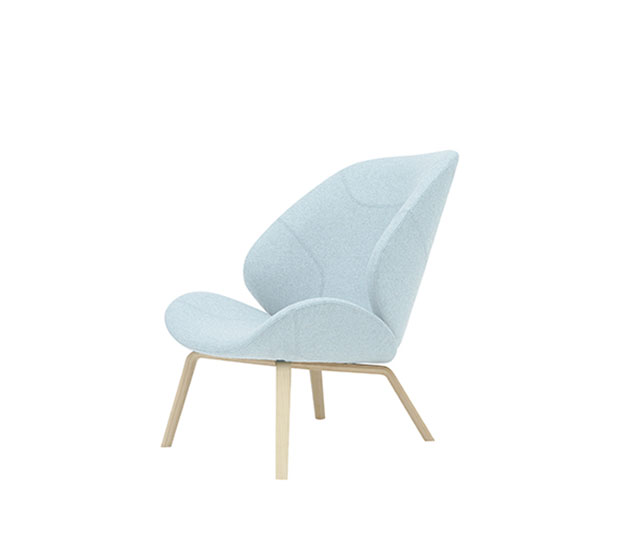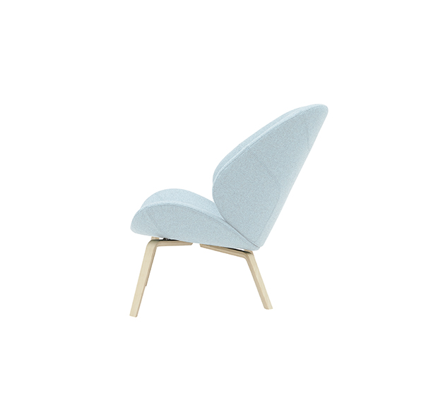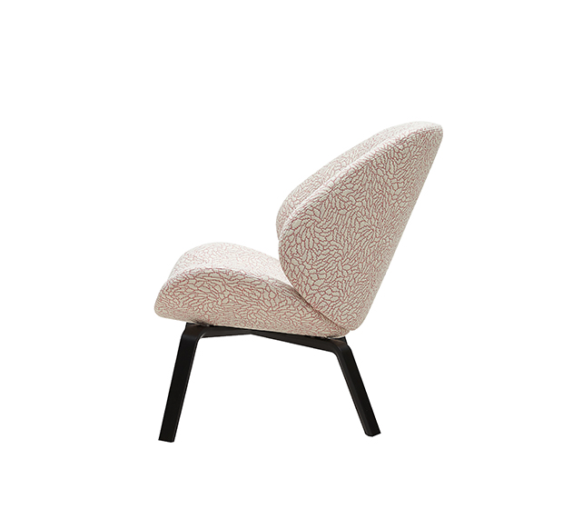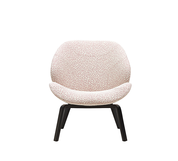Fauteuil lounge sans bras. Assise et dossier rembourrés, structure en frêne naturel ou laqué.