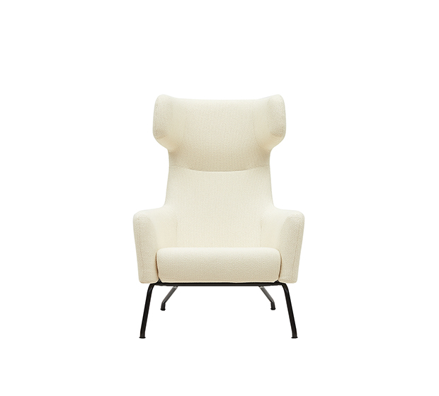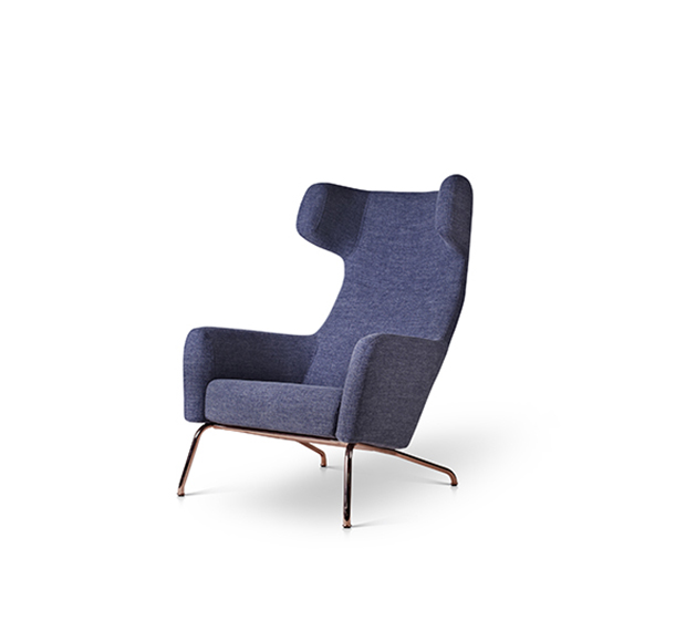 Fauteuil lounge avec bras. Assise et dossier rembourrés, structure tubulaire ronde en métal cuivré ou peint.