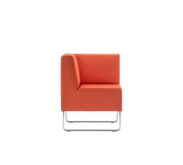 Fauteuil modulaire à base traîneau. Élément de coin, assise et dossier rembourrés, structure tubulaire ronde en acier chromé ou peint. Paire d’unités de liaison incluse.