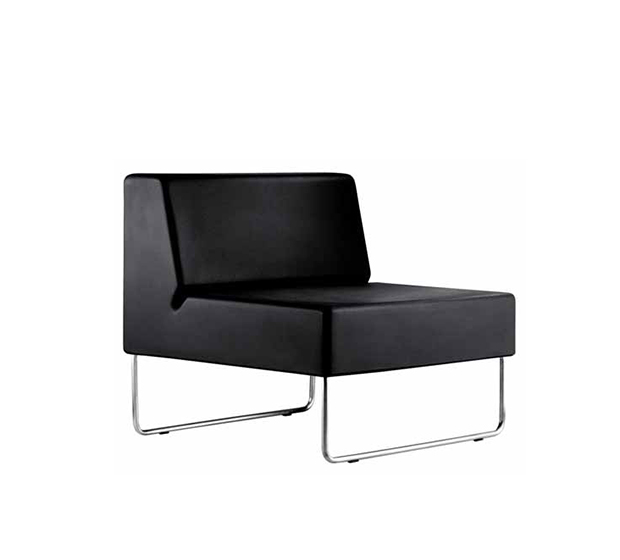 Fauteuil modulaire à base traîneau. Élément simple, assise et dossier en polyéthylène, structure tubulaire ronde en acier brossé. Paire d’unités de liaison incluse.