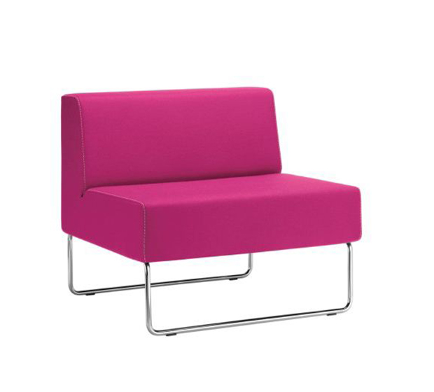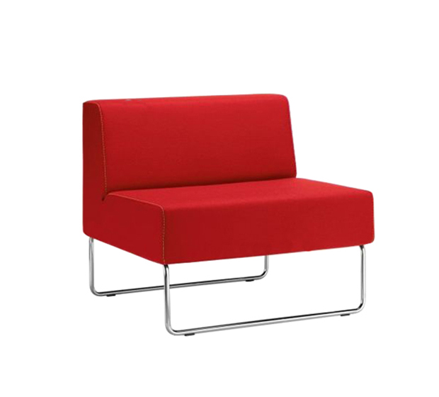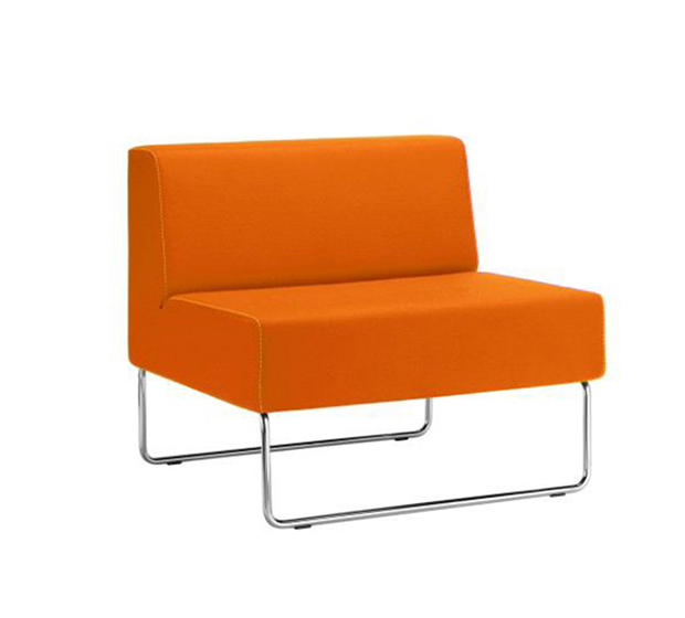 Fauteuil modulaire à base traîneau. Élément simple, assise et dossier rembourrés, structure tubulaire ronde en acier chromé. Paire d’unités de liaison incluse.