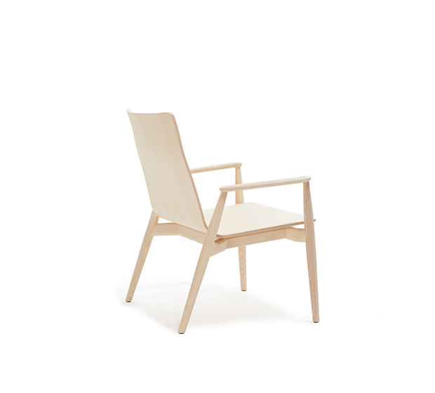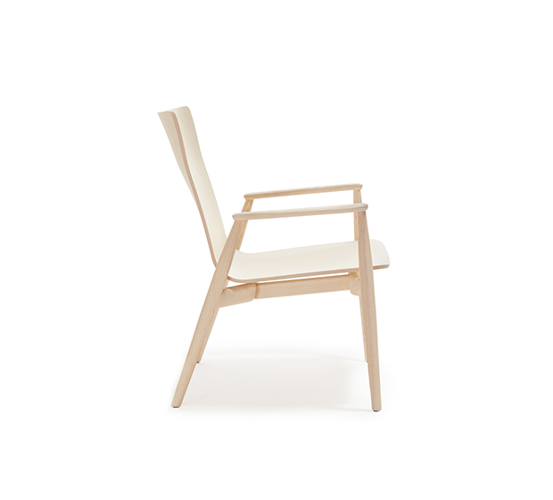 Fauteuil lounge avec bras. Assise et dossier en bois, structure en frêne massif.
