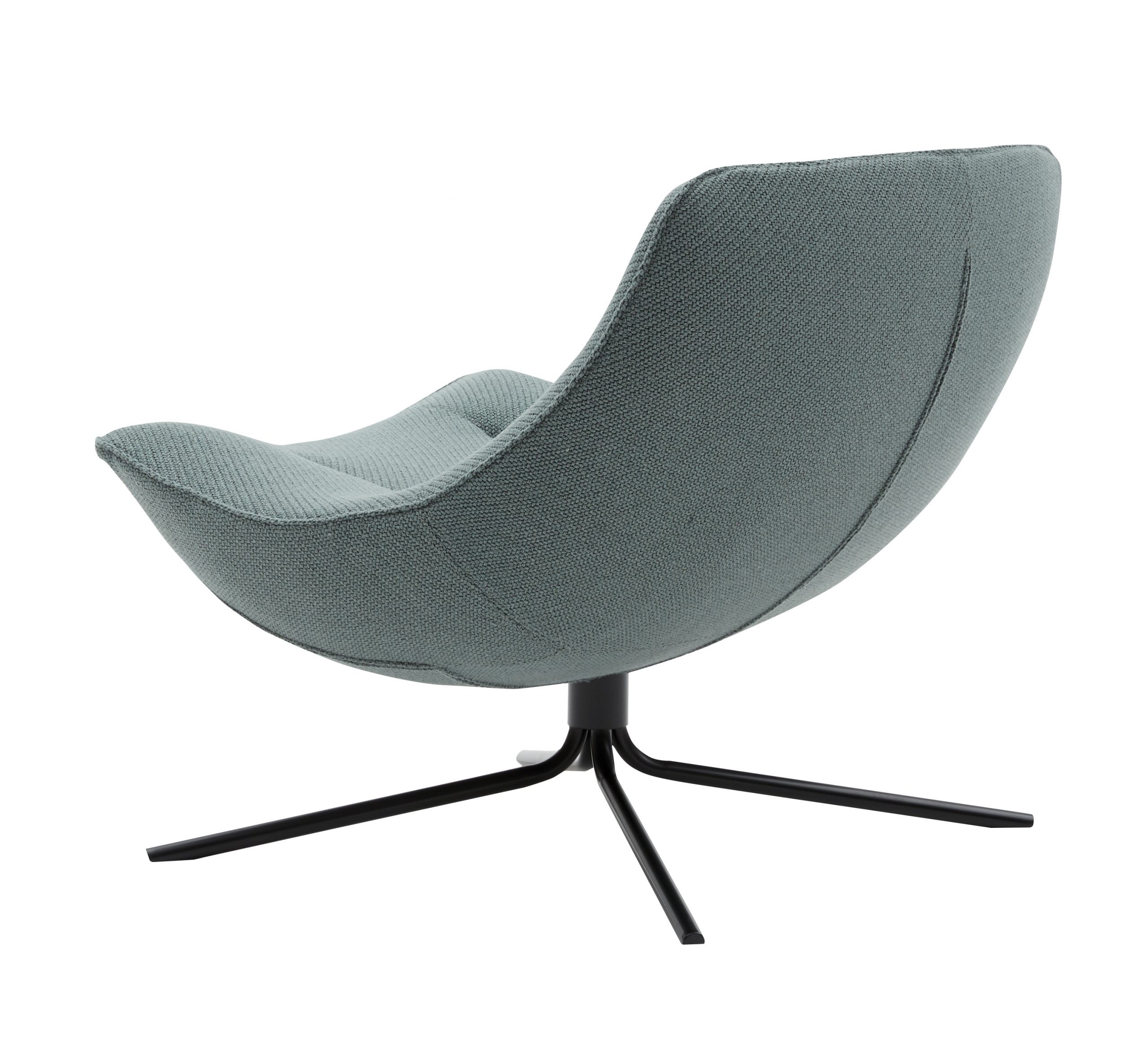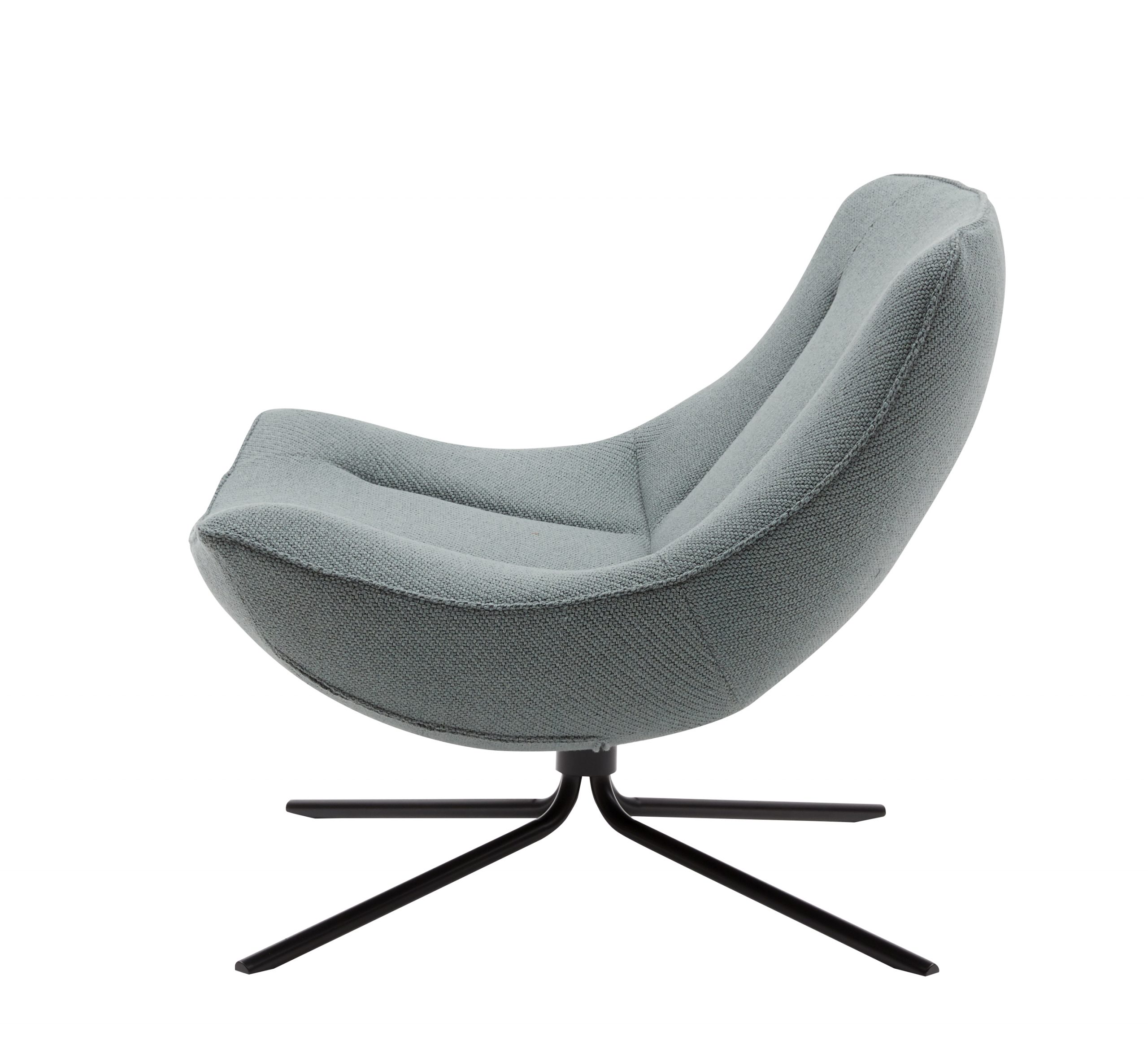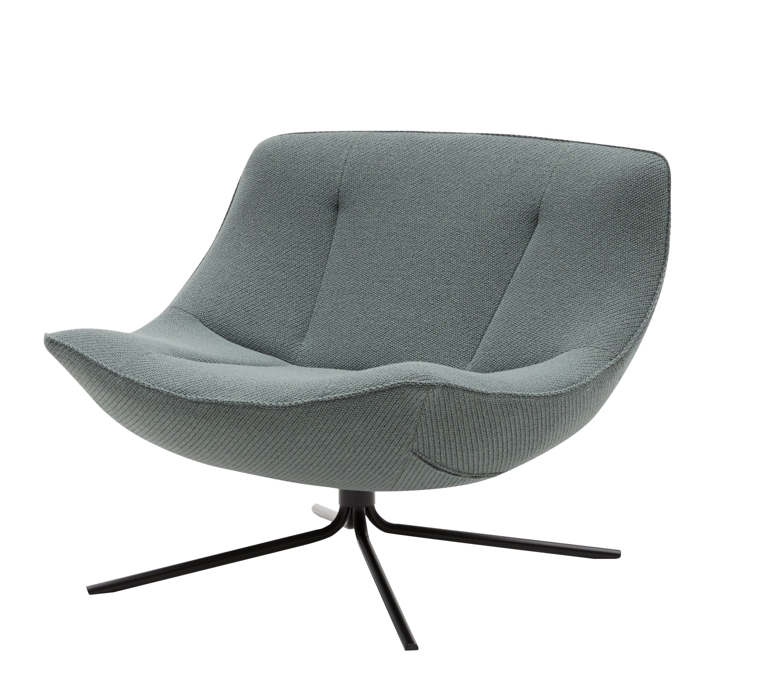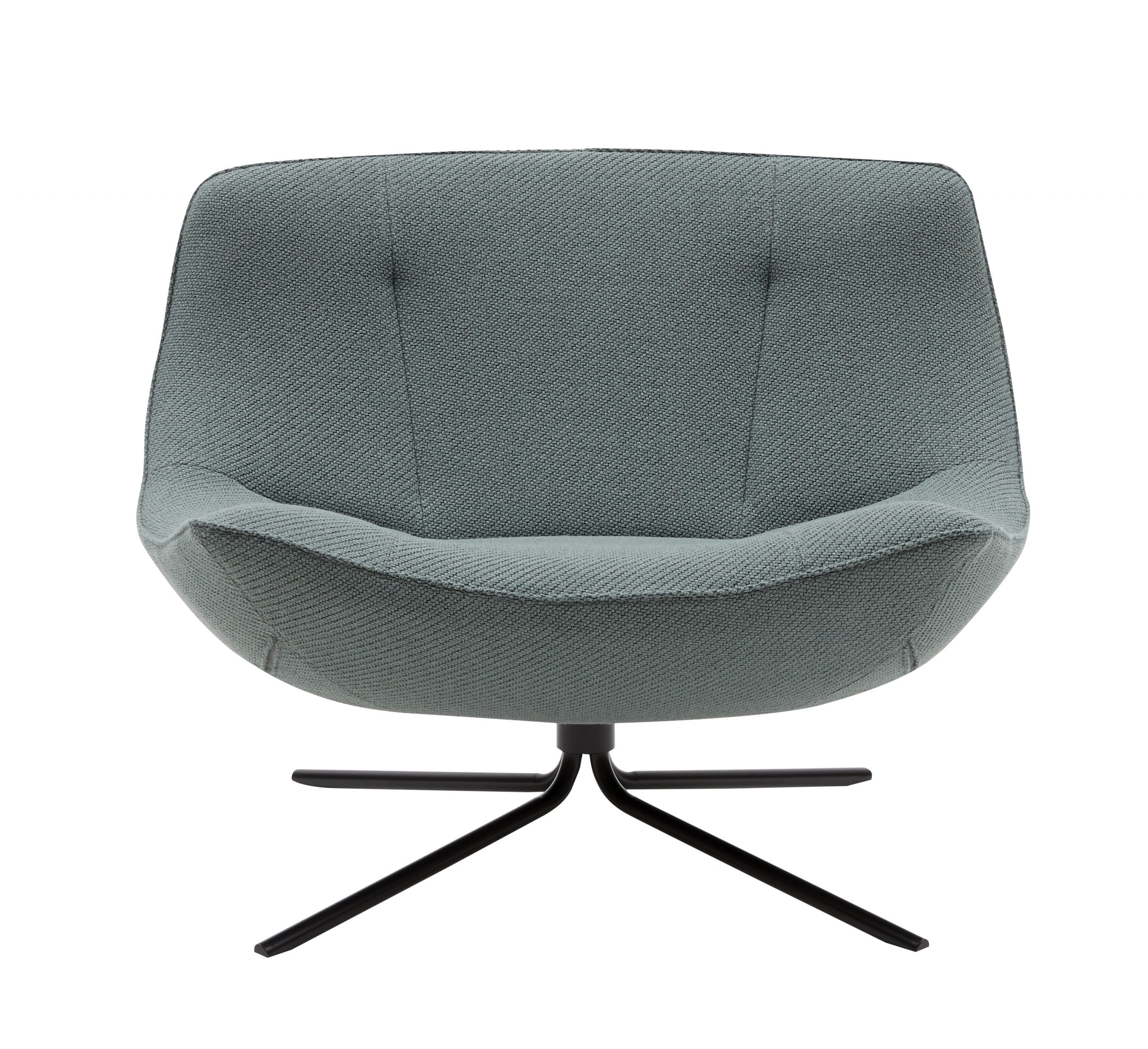Fauteuil lounge à une place. Assise et dossié rembourrés, base en aluminium pivotante.