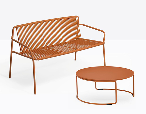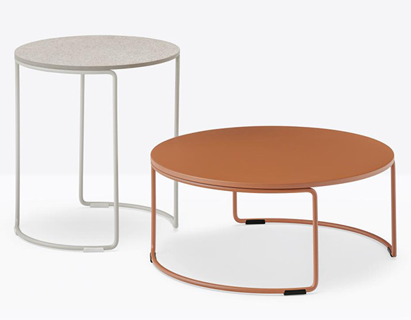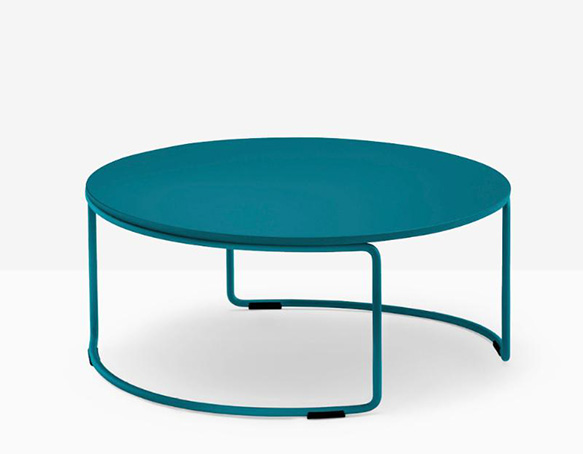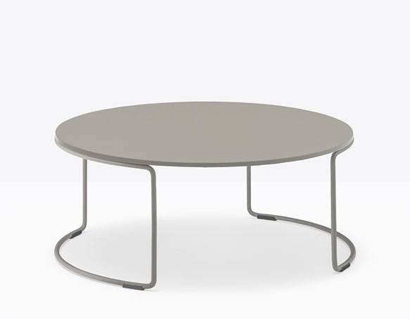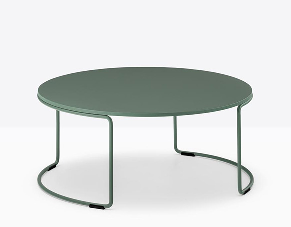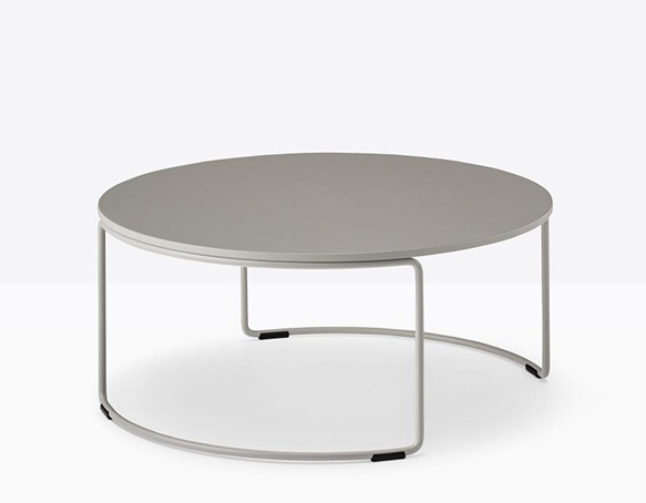 Table basse. Base en tige d’acier, fini peint. Plateau rond disponible en stratifié compact, acier, ou finition Fenix. Certains finis sont adaptés à l’usage extérieur.