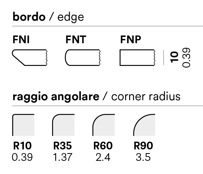 Plateau de table en stratifié. Finition effet marbre FENIX. Disponible en différentes formes et tailles. Coeur noir ou blanc. Chant plat, rond, ou incliné. Épaisseur 0.39″.
