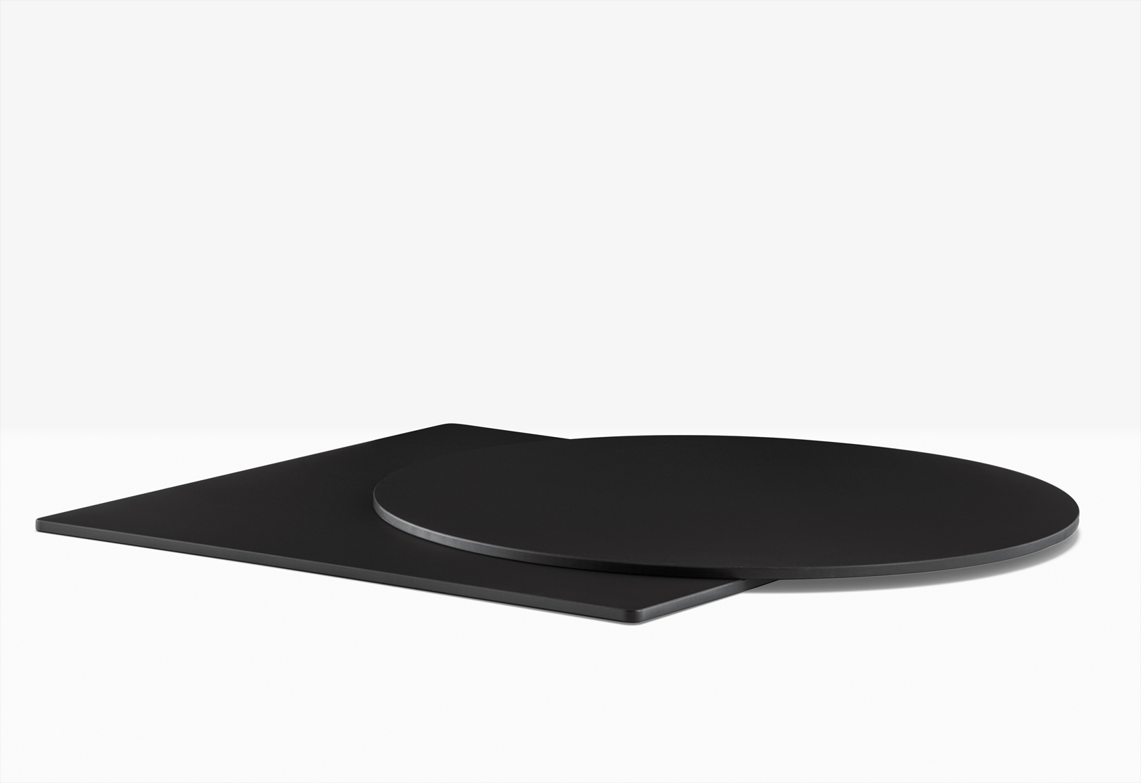 Plateau de table en stratifié. Finition FENIX. Disponible en différentes formes et tailles. Coeur noir et chant plat. Épaisseur 0.39″.