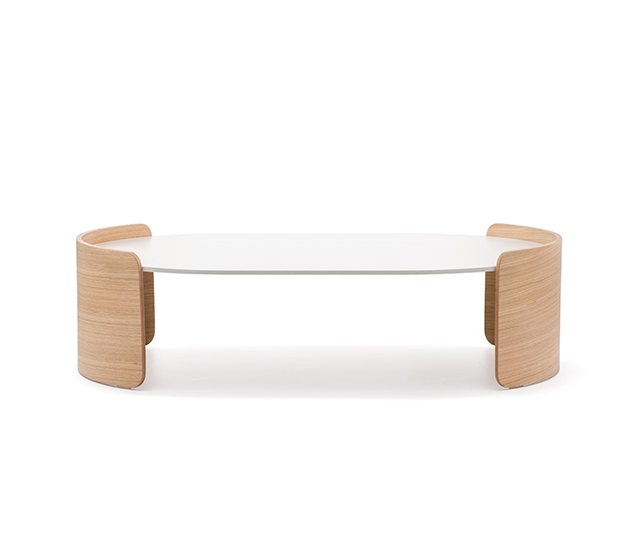 Table d’appoint. Plateau ovale en laminé compact, structure en contreplaqué de chêne. Hauteur basse.