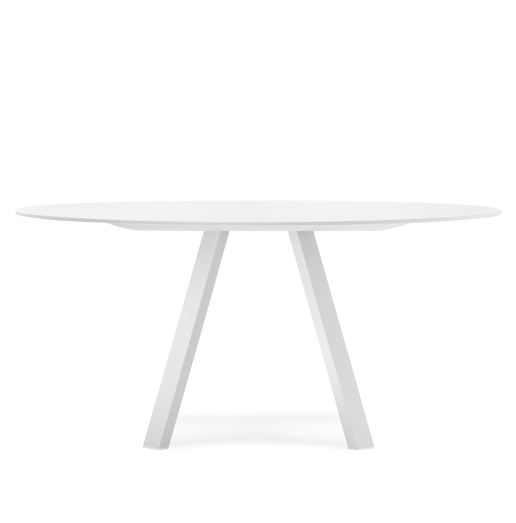 Table ronde avec plateau laminé, structure en aluminium et pattes en acier. Hauteur standard.
