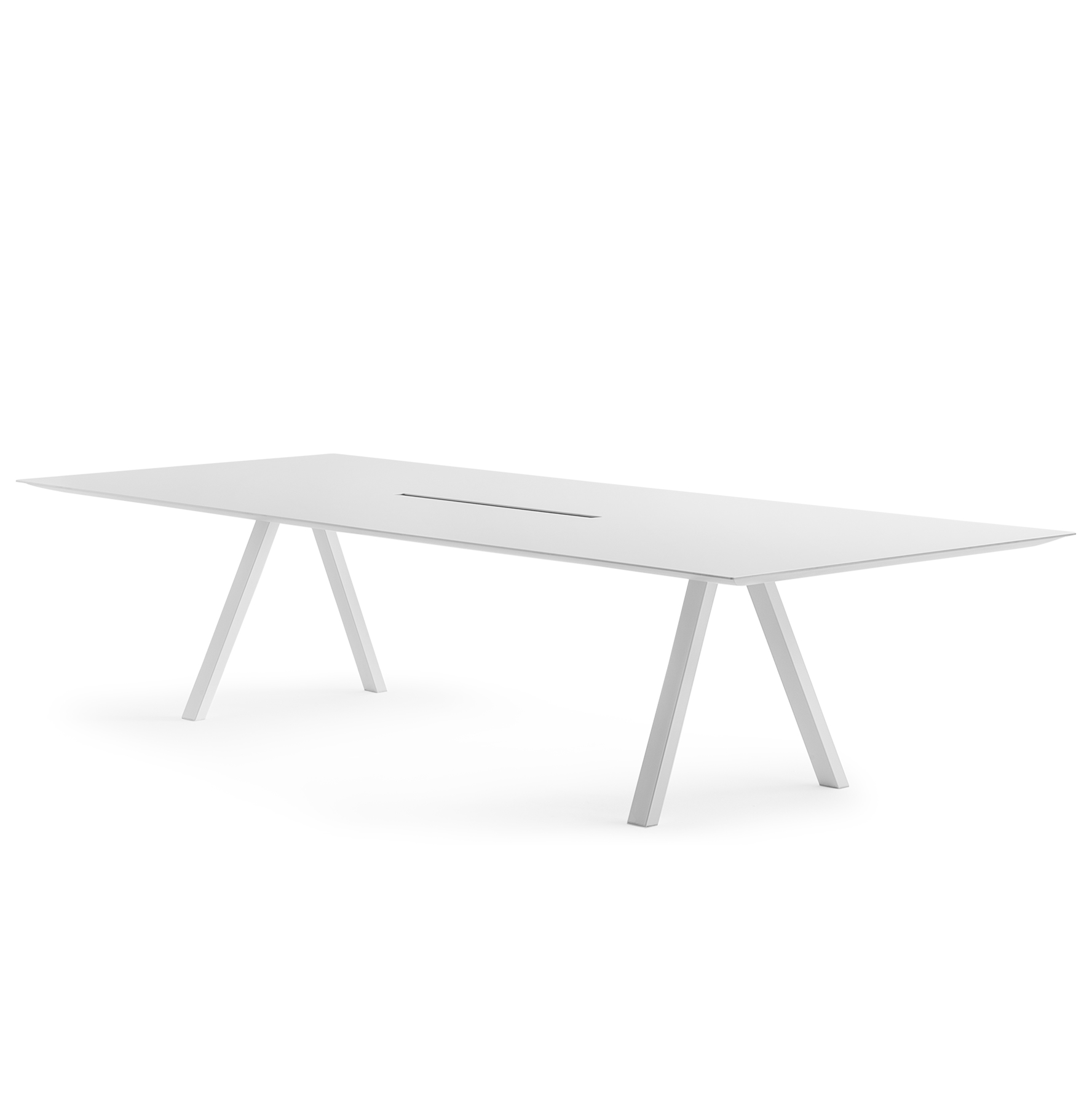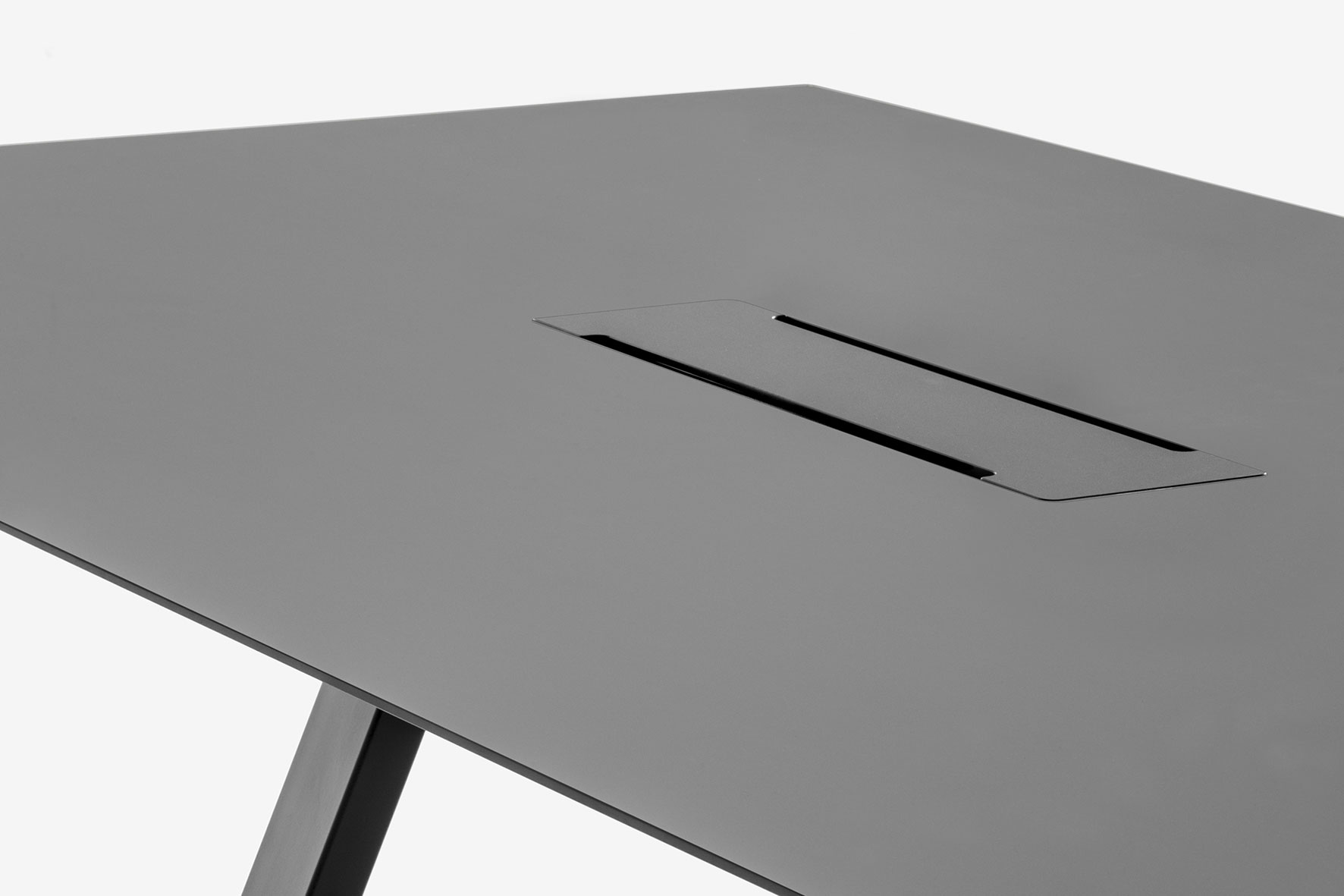 Table avec plateau laminé, structure en aluminium et pattes en acier. Adapté aux espaces de bureau. Aussi disponible en version CC60 avec fente pour les câbles électroniques.