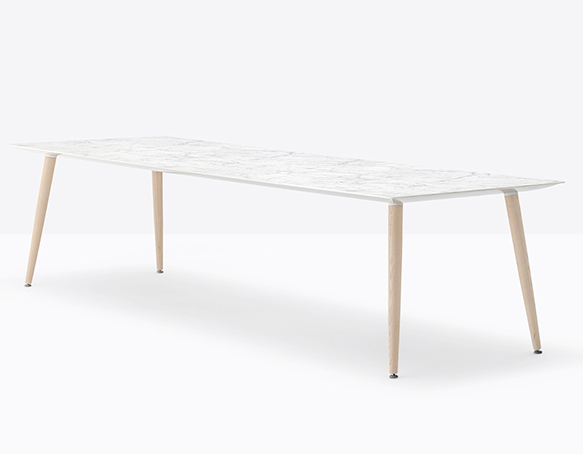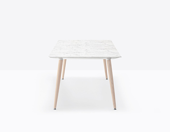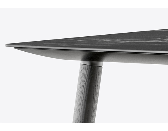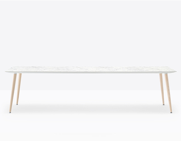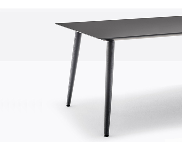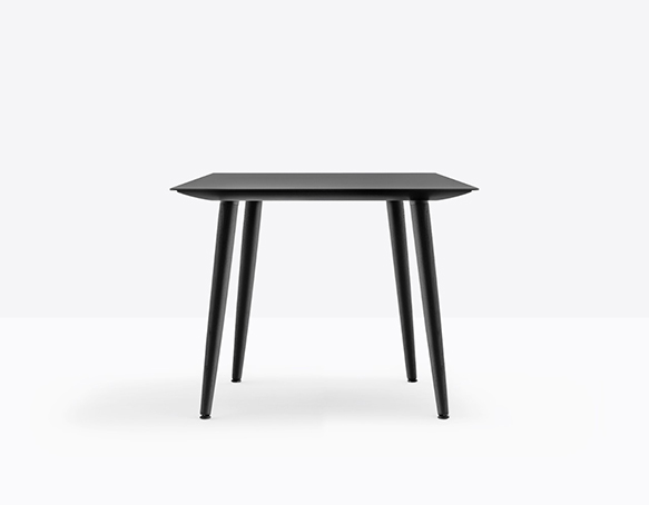 Table hauteur standard. Pieds en frêne massif, plateau carré, rond, ou rectangulaire. Cadre de support en aluminium extrudé.