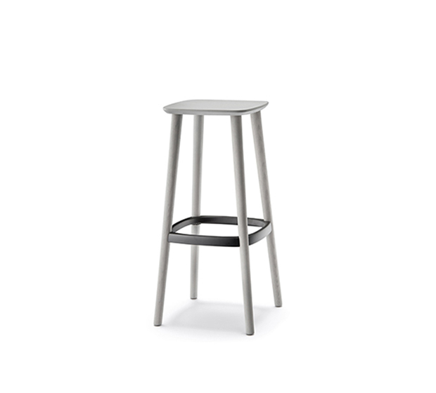 Tabouret hauteur bar. Assise en bois, structure en frêne avec repose-pied en métal.