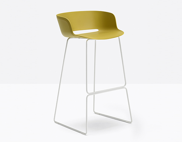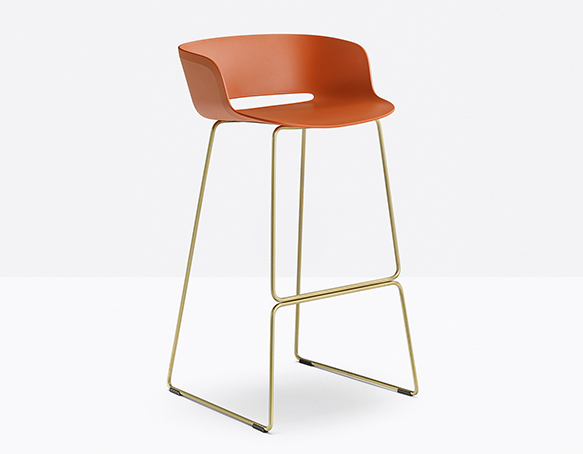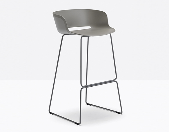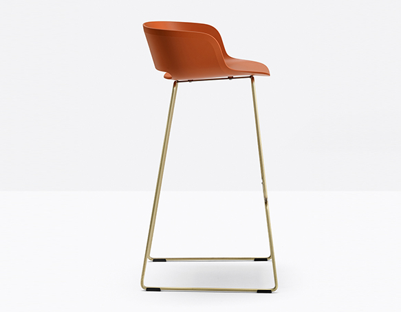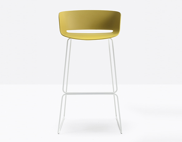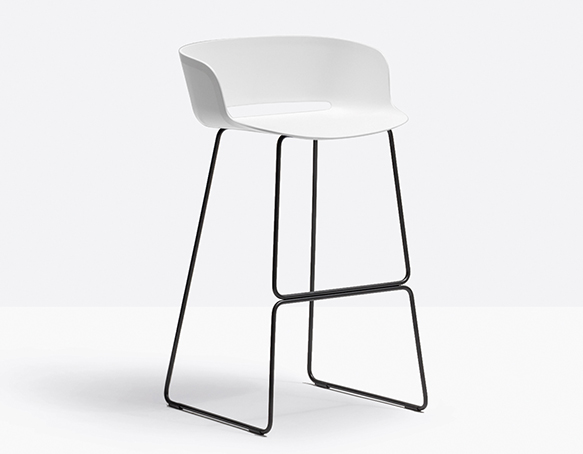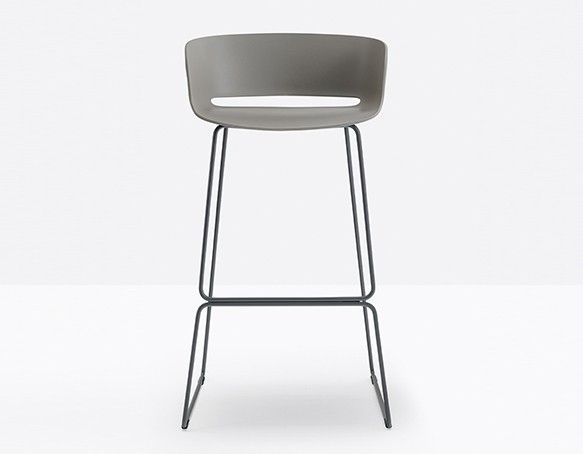 Tabouret hauteur bar. Assise et dossier en polypropylène. Structure traineau en fil d’acier.