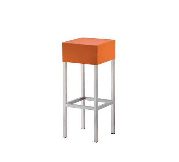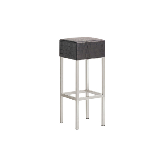 Tabouret hauteur bar. Assise rembourrée, structure tubulaire carrée en acier chromé, satiné ou laiton antique.