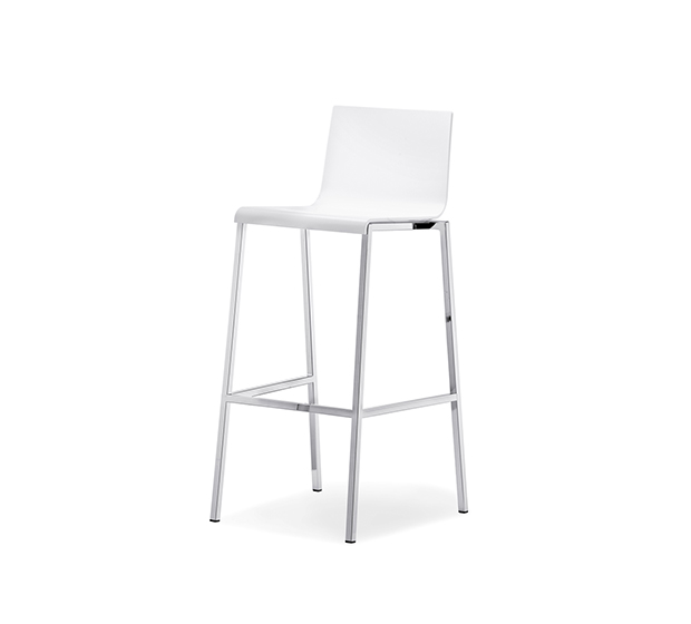Tabouret hauteur bar. Assise et dossier en technopolymère, structure tubulaire carrée en acier chromé, satiné ou peint argent.