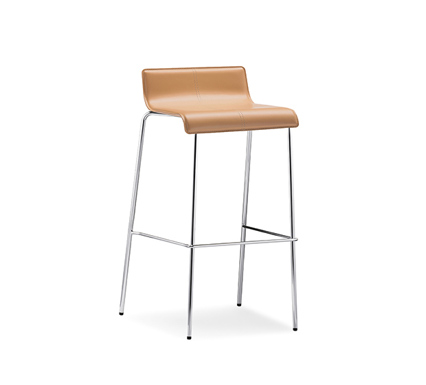 Tabouret hauteur bar. Assise et dossier rembourrés en cuir ou cuir régénéré avec coutures visibles, structure tubulaire ronde en acier chromé, mat ou peint argent.
