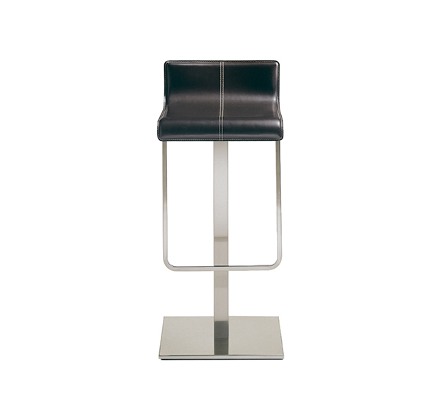 Tabouret hauteur comptoir, à base centrale pivotante. Assise et dossier rembourrés en cuir véritable ou régénéré avec coutures visibles, structure en acier satiné.