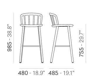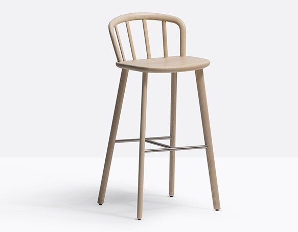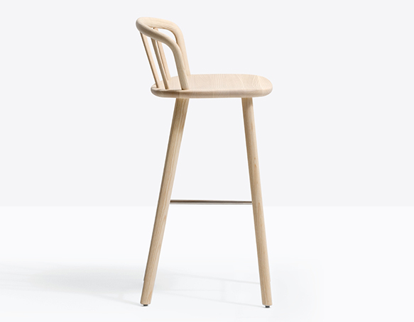 Tabouret hauteur bar. Dossier en bois courbé, assise en bois massif. Structure à quatre pattes en frêne massif, repose-pieds en acier inoxydable.