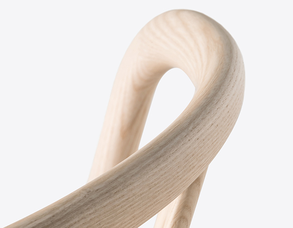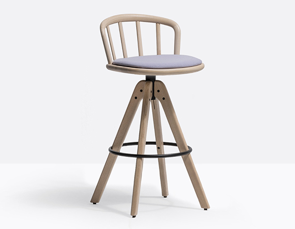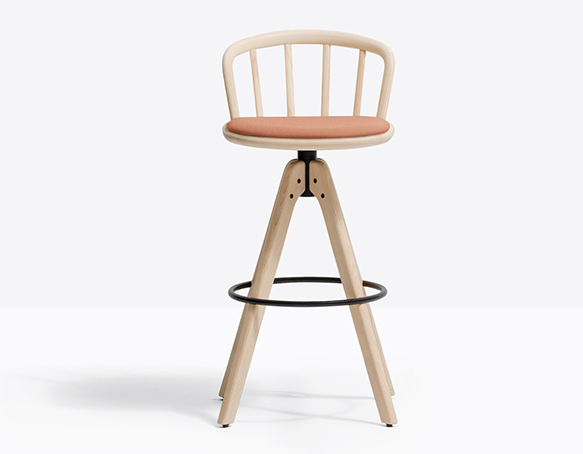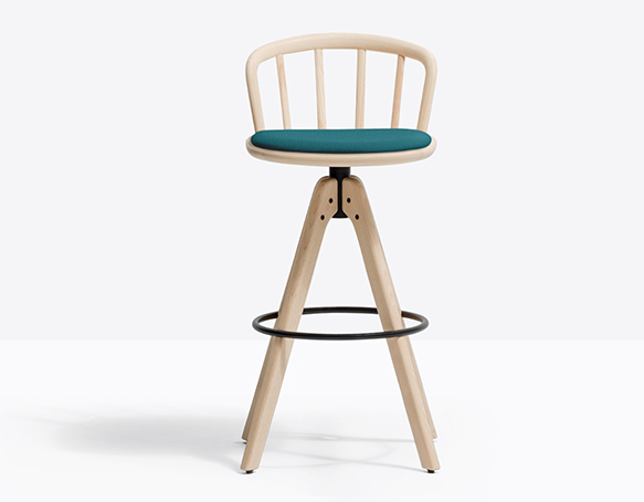 Tabouret pivotant, hauteur bar. Dossier en bois courbé, siège en bois massif avec assise rembourrée. Structure à tréteau en frêne massif, repose-pieds circulaire en acier.