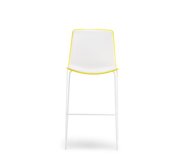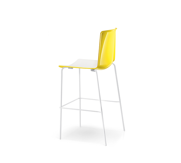 Tabouret hauteur bar, empilable. Assise et dossier en polypropylène, fini brillant à l’extérieur et fini anti-rayure mat à l’intérieur, structure tubulaire ronde en acier chromé, chromé noir ou peint. Structure peinte non disponible dans les finis AR et GI.