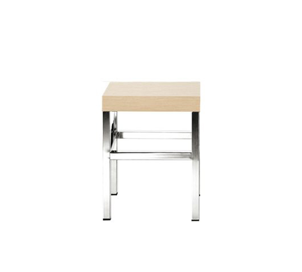 Tabouret hauteur chaise. Assise en bois, structure tubulaire carrée en acier chromé ou satiné.
