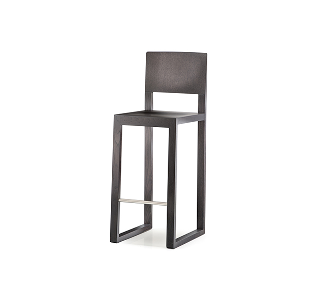 Tabouret hauteur comptoir à base traîneau. Assise et dossier en bois, structure en chêne.