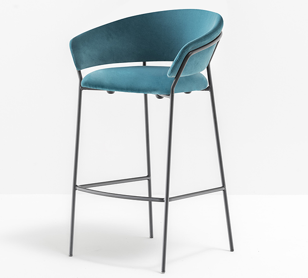 Tabouret hauteur comptoir à bras. Assise et dossier rembourré, structure en acier chromé ou peint.