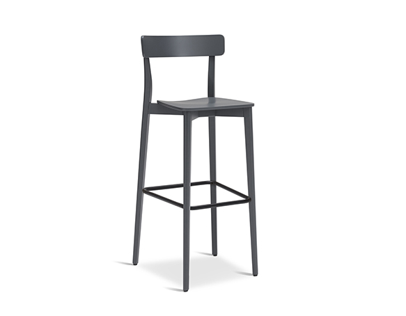 Tabouret en bois, hauteur bar. Structure et dossier en chêne ou bois de hêtre, assise en contreplaqué. Disponible en bois teint ou laqué.