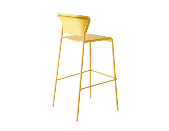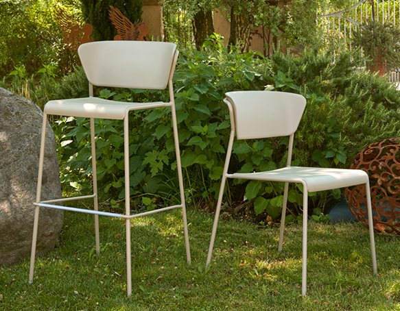 Tabouret empilable. Assise et dossier en technopolymère, structure en métal. Deux hauteurs disponibles. Adapté à l’usage extérieur.