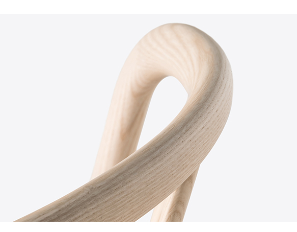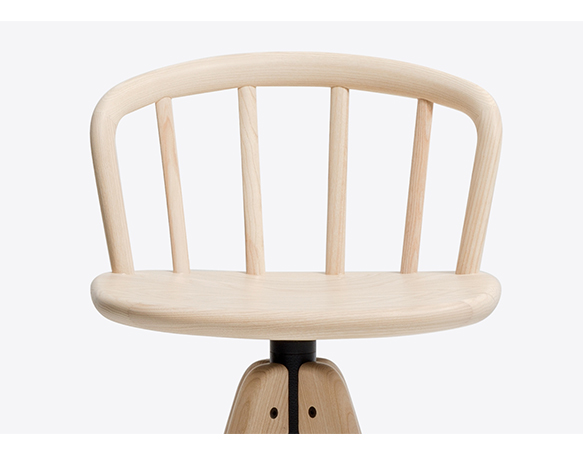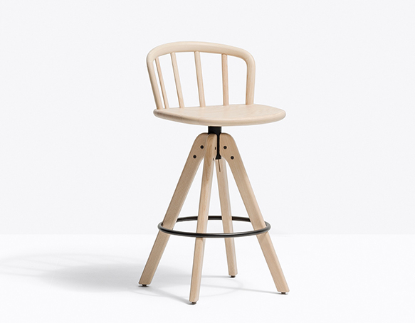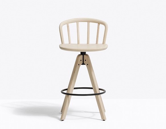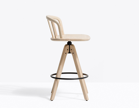Tabouret pivotant, hauteur comptoir. Dossier en bois courbé, assise en bois massif. Structure à tréteau en frêne massif, repose-pieds circulaire en acier.