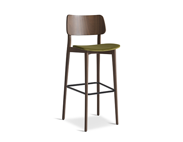 Tabouret en bois, hauteur bar. Assise rembourrée. Disponible en bois teint ou laqué.